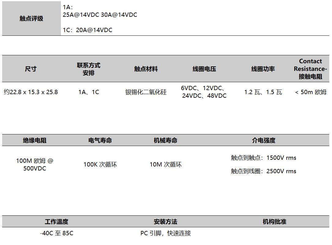 ● A1 系列的开关容量高达 30A,适用于汽车和车灯配件。安装方法为 PC 引脚或快速连接。触点排列选项为 1A 或 1C,线圈功率选项为 1.2W 或 1.5W。A1 系列尺寸为 22.8 x 15.3 x 25.8 毫米。