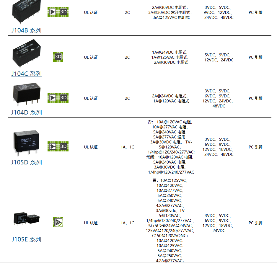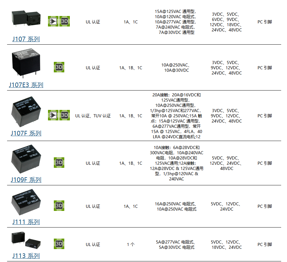 开关容量高达10A,体积小,重量轻,线圈功耗低,接触负载高