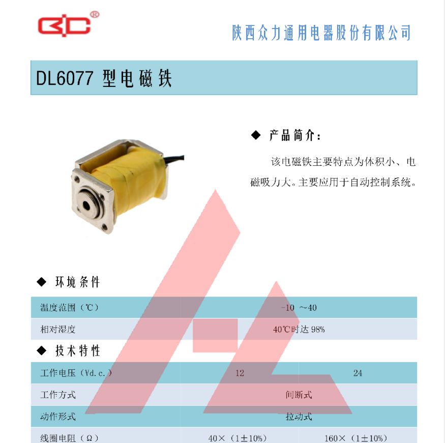 ● DL6077型医疗器械电磁铁 工作电压: 12/24V 工作方式: 间断式 动作形式: 拉动式 电磁吸力: ≥0.42Kg